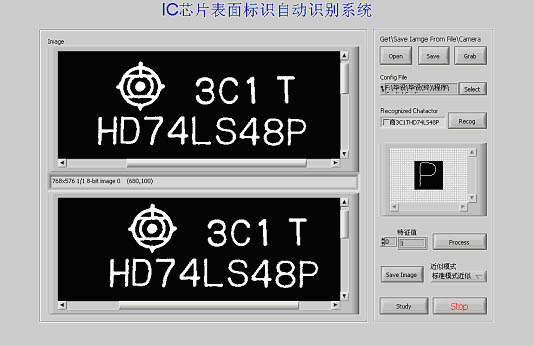 效果和结论 我们运用美国NI公司的LabVIEW、IMAQ Vision以及PXI等先进的虚拟仪器技术,通过众多图像处理模块的功能实现,在较短时间内建立了一套完整的芯片表面标识自动识别系统。该系统能够自动定位跟踪摄像头视场中的芯片,将芯片剪切出来,然后通过一系列的图像处理过程,对芯片上的文字进行逐一提取,再对文字图像进行细化,最后系统通过文字的细化结果等获取图像的特征信息,并与标准模板进行匹配,从而完成对文字的识别。系统具有较广范围的适用性,能够完成包括厂商标志图标等对象的识别;还具有较高的实用价值,配合芯片自动测试系统,将极大提高生产能力和效率,因此具有极其广阔的应用前景。